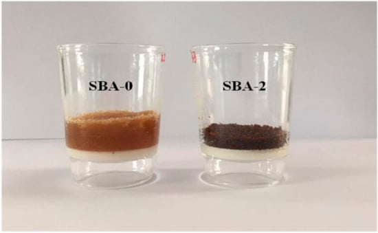 Gluability of an SBA can be evaluated by measuring the shear strength of plywood bonded with SBA. The shear strength of plywood after soaking in water at 63 °C for 3 h is presented in Figure 5. Shear strength increased initially, then decreased as the HCl concentration was increased, in accordance with the observed variation in the reducing sugar content (Table 1). This could be ascribed to cross-linking between reducing sugars and proteins by Maillard reactions. It has been reported that cross-linking of proteins can improve the mechanical properties of cured adhesives [44,45]. Plywood bonded with SBA-2 possessed the highest shear strength (1.18 MPa), and achieved the highest water resistance of all SBAs in this experiment. In order to further evaluate the water resistance of the SBA, the solubility of cured SBA was studied by a sol–gel test. The filtered SBA after boiling water treatment was shown in Figure 6. Compared with cured SBA-0, cured SBA-2 showed a slight decrease in the amount of sol fraction (Table 2). However, the swelling of the cured SBA-2 was obviously lower than SBA-0, indicating that the water resistance of adhesive was improved by hydrolyzing carbohydrates in DSF. As we know, carbohydrates interact closely with proteins through hydrogen bonding, but hydrogen bonds are easily broken under wet conditions, which decreases the water resistance of SBAs. Carbohydrates from soybean can be hydrolyzed into reducing sugars that are highly reactive and readily cross-link with protein to generate a network structure that prevents water immersion and thus improves the water resistance of the resultant adhesives. The shear strength of plywood bonded with SBAs in the present study met the requirements (≥0.8 MPa) of the Chinese National Standard GB/T 9846-2015 for plywood type II, indicating suitability for interior plywood applications.