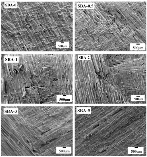 In order to assess the bonding performance of the adhesives, SEM images of the fracture surface of plywood specimens were obtained after shear strength tests. As shown in Figure 7, interfacial failure was observed in the fracture surface of plywood bonded with SBA-0, SBA-0.5, and SBA-5, suggesting that the cohesive forces of the cured SBAs were stronger than the interfacial forces between adhesives and Pinus massoniana wood. In contrast, SBA-1, SBA-2 and SBA-3 showed an excellent gluability to Pinus massoniana wood, because wood failure was observed in the plywood specimens. These results can be explained by differences in chemical reactivity, distribution and penetration of SBAs. (i) Insoluble carbohydrates are mostly polysaccharides with poor permeability in wood cells (e.g., SBA-0 and SBA-0.5); (ii) Reducing sugars are highly reactive and readily react with proteins via Maillard reactions (e.g., SBA-1, SBA-2 and SBA-3). However, some reducing sugars (e.g., glucose) act as micromolecules that readily soak into the wood, causing “drying out”, resulting in decreased gluability, as observed with SBA-5. Therefore, an optimum HCl concentration (e.g., 2.0%) for generating hydrolyzed carbohydrates can improve the gluability of an SBA.
