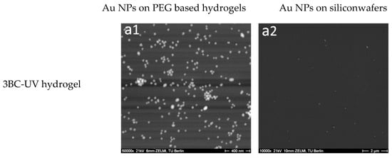 SEM images shown in Figure 3 provide a direct observation for the distribution of Au NPs on the hydrogels. As can be observed from Figure 3a1,d1, a monolayer of Au NPs is present on the surface of 3BC-UV and 8PEG-VS-SH hydrogels after the hydrogels were peeled off from silicon wafers. Only few Au NPs are left on the silicon wafers shown in Figure 3a2,d2. The transfer efficiency of Au NPs from silicon wafers to these hydrogels is 99.8% and 98% (Table 2), respectively, indicating that virtually all Au NPs are transferred from silicon wafers onto the surface of 3BC-UV and 8PEG-VS-SH hydrogels. In contrast, hardly any Au NPs are detected on the PEG575-UV and 8PEG-UV hydrogels shown in Figure 3b1,c1. The transfer efficiency of Au NPs from silicon wafers to these hydrogels is less than 1% (Table 2).