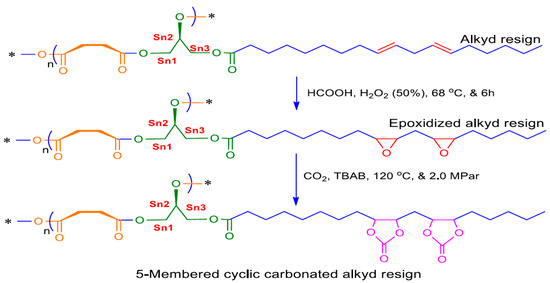 The epoxidation and cyclic carbonation of alkyd resin were conducted by following the same procedures as that of the functional group modification of JCO, as shown in Figure 2. The synthesis method of CC-AR was similar to the synthesis of CJCO. Since the optimization has been done on the CJCO synthesis, the same optimization parameters were also used for the preparation of CC-AR.