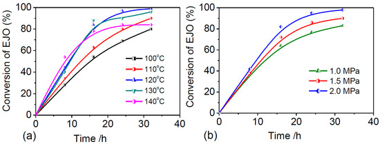 In the present study, high reaction temperatures of 130 to 140 °C exhibited low conversion yield of five-member cyclic carbonate. However, a high yield was achieved at 120 °C under 2.0 MPa, as shown in Figure 3a. This finding could be attributed to the thermal decomposition and mass loss of TBAB, which significantly influences the catalytic carbon dioxide fixation [41]. Figure 3b shows no significant differences in the initial carbonation yield between 1.0 and 2.0 MPa of CO2. However, the carbonation yield of EJCO varied after 30 h. Furthermore, Motokura et al. [42] have observed certain advantages in increasing the CO2 pressure between 3.0 and 5.0 MPa at 130 °C within a 7 h reaction period. In this study, the high carbonation period of 30 h and the stability of TBAB at low temperature were linked to a high CO2 gradient. Figure 5 shows the high carbonation yield at a low reaction pressure of 2.0 MPa and low temperature of 120 °C. Considering the thermal stability of TBAB and the carbonation yield with respect to the CO2 pressure, it could be stated that the optimal carbonation conditions would occur at the temperature of 120 °C and under the pressure of 2.0 MPa of CO2 with a fixed amount of 3.5 mol % of TBAB. Table 2 shows the comparative reaction parameters used for cyclic carbonation of various VOs in the presence of TBAB.