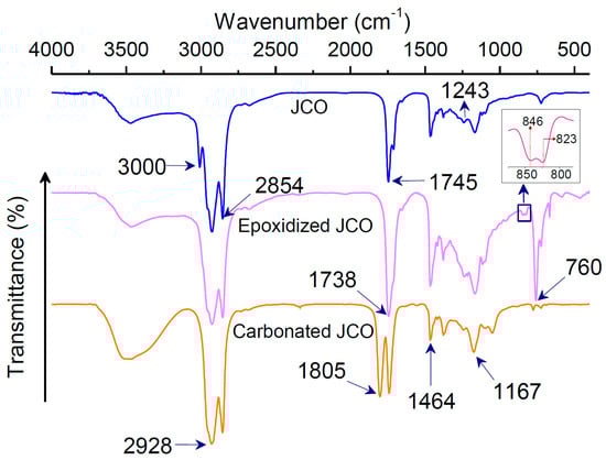 FTIR spectra of Jatropha curcas oil (JCO), epoxidized JCO, and carbonated JCO.