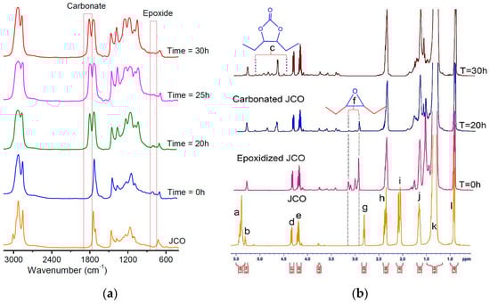 Spectra of catalytic carbon dioxide fixation via carbonation of epoxidized JCO based alkyd resin (a) FTIR spectra; (b) 1H-NMR with reaction parameters of 120 °C, 2.0 MPa, and 3.5 mol % of TBAB.