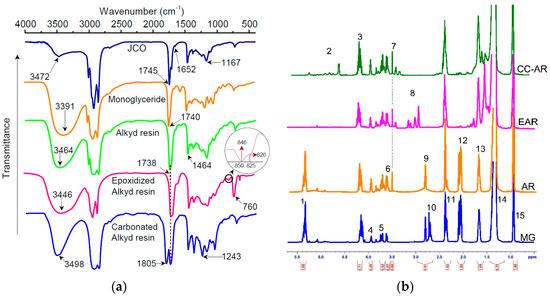 FTIR and 1H-NMR analyses were applied to examine the corresponding peak confirmation and chemical shift of the monoglyceride, AR, EAR, and CC-AR protons. Scheme 1 illustrates the reaction scheme of the monoglyceride and AR synthesis. The FTIR spectrum of monoglyceride assigns the peaks at 3391 cm−1 (attributed to the hydroxyl groups of the monoglyceride of JCO) and 2855 cm−1 (–C–H asymmetric stretching vibration of –CH2 groups), 3464 cm−1 (attributed to the hydroxyl groups of the alkyd resin of JCO), 1740 cm−1 (C=O stretching vibration of monoglyceride), 1738 cm−1 (C=O stretching vibration of alkyd resin), 1652 cm−1 (assigned to the –CH=CH–), 1464 cm−1 (–CH2 scissoring), and 1243 cm−1 (–CH2 wagging), as illustrated in Figure 6a.