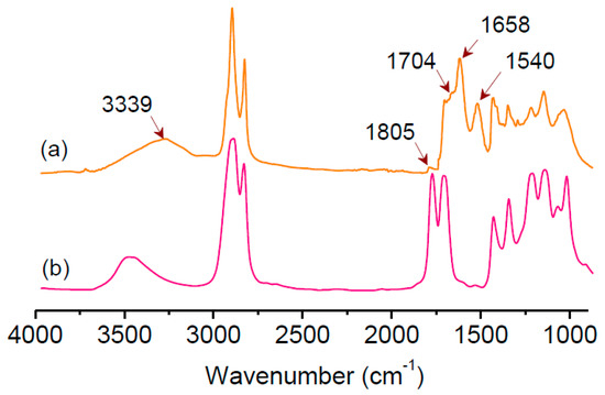 FTIR spectra of CJCO (a) after being cured with isophorone diamine (IPDA); (b) before curing with isophorone diamine.
