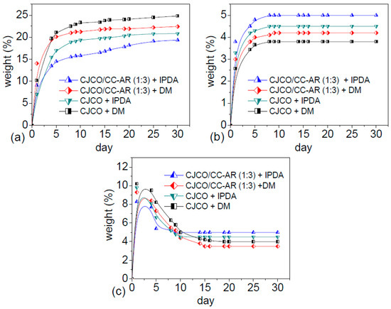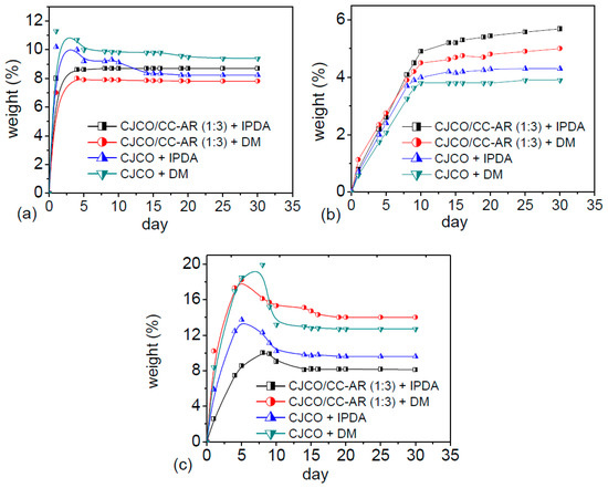 By contrast, all NIPU films exhibited a significant weight augmentation in their swelling–time diagram under the NaCl solvent system, as shown in Figure 10b. Figure 9C shows the morphology of the film of the CJCO/CC-AR blend (ratio of 1:3) cured with IPDA after salt treatment. The weight augmentation might be due to the strong electrostatic interactions of the SCI toward the β-hydroxyurethane groups on the film surface, which could promote chemisorption [56].
