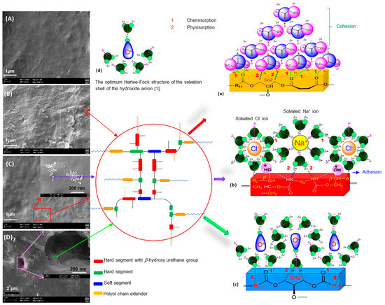 FESEM images of the CJCO/CC-AR blend (ratio 1:3) based NIPU with IPDA: (A) before solvent treatment; (B), (C), and (D) after solvent treatment. Interfacial surface of the NIPU: (a) after being treated with MEK; (b) after being treated with 10% NaCl; (c) after being treated with 5% NaOH; (d) the optimum Hartee-Fock structure of the solvation shell of the hydroxide anion [1].