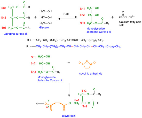 Reaction scheme of monoglyceride and alkyd resin of the Jatropha curcas oil.