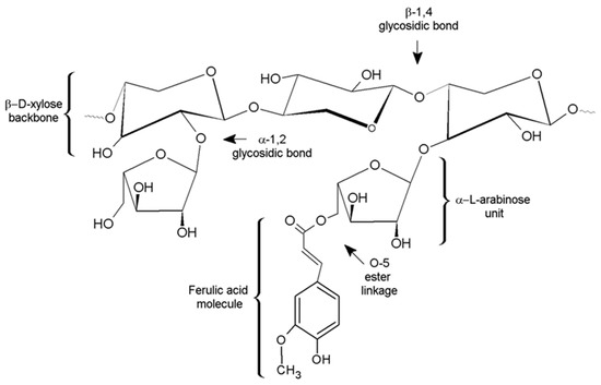 Arabinoxylans (AXs) are hemicellulose polysaccharides constituted by a linear backbone of β-(1–4)-linked d-xylopyranosyl units to which α-l-arabinofuranosyl units are attached trough α-(1–3) and/or α-(1–2) linkages (Figure 1). In addition, ferulic acid (FA) (3-methoxy, 4 hydroxy cinnamic acid) molecules may be ester-linked on the (O)-5 position to some of the arabinose residues. Some other components like galactose, glucoronic acid, and p-coumaric acid may exist in AX side chains [1].