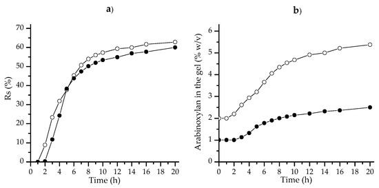 The syneresis ratio percentage (% Rs) of gels describes the amount of solvent released from the gel network. The Rs percentage of AX-1 and AX-2 gels after 1 h of laccase exposure (near the plateau region in Figure 3a,b) was registered for 20 h at 25 °C. Changes in % Rs and AX concentration in the gels were calculated from the once removal method (ORM), and the results are presented in Figure 6. Ako [15] has reported that the ORM may allow the gel to stabilize in its fluid; in the present study, % Rs stabilization occurred after 20 h. Some authors [15,16] have reported that increasing the polymer concentration decreases the syneresis ratio as a result of the corresponding increase in elasticity. Nevertheless, in the present work, % Rs values at the end of the test were 60.0 ± 0.9 and 62.8 ± 0.6 for the AX-1 and AX-2 gels, respectively, and thus were not significantly different.