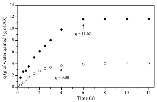 The swelling ratio (q) of gels describes the amount of water stored within the gel network. The equilibrium swelling of AX-1 and AX-2 gels was analyzed in gels after % Rs stabilization (20 h after laccase-induced gelation for both gels). Swelling experiments before % Rs stabilization could not be determined if changes in the weight of the gel were due to liquid entrance (swelling), expulsion (syneresis), or both. The equilibrium swelling time and q value were 6 h and 4 h and 11.67 ± 0.15 and 3.88 ± 0.08 g water gained/g AXs for AX-1 and AX-2 gels, respectively (Figure 7). This difference could be related to the weaker structure of the AX-1 network as a result of the lower polysaccharide concentration, while AX-2 gel presented a more compact structure that restricts water uptake; a similar behavior has been previously reported by Carvajal-Millan et al. [6] for laccase-induced wheat AX gels at different polysaccharide concentrations.
