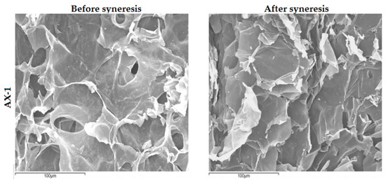 Macroscopic observation of both gels (AX-1 and AX-2) after 20 h of syneresis development clearly showed a liquid phase surrounding the samples (Figure 5).