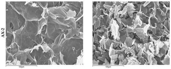 AX-1 and AX-2 gels were frozen by liquid nitrogen immersion and then lyophilized at −37 °C/0.133 mbar in a Freezone 6 freeze drier (Labconco, Kansas, MO, USA). Lyophilized gels were coated with a thin layer of gold, and the microstructures were studied by scanning electron microscopy (SEM) (JEOL 5410LV, JEOL, Peabody, MA, USA) at low voltage (20 kV). SEM images were obtained in secondary electron image modes (SEI).