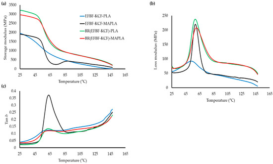 The results on dynamic mechanical properties which depict the temperature dependence on dynamic storage modulus (Figure 4a), loss modulus (Figure 4b) and tanδ (Figure 4c) for the hybrid biocomposites are presented. From Figure 4a, the storage modulus value at 25 °C for EFBF-KCF-PLA hybrid system was 1936 MPa, which increased upon BR treatment of fibers i.e., BR(EFBF-KCF)-PLA (1952 MPa). Further significant improvement was noted in the hybrid system, involving BR-treated hybrid fiber reinforced MA modified PLA i.e., BR(EFBF-KCF)-MAPLA (2998 MPa). This trend remained similar even at higher temperatures, hence suggesting that BR(EFBF-KCF)-MAPLA has a better storage modulus among the hybrid systems. Previously, addition of MA has been reported to improve the storage modulus of PP-clay hybrid [50]. Also, the storage modulus of all the hybrid systems tended to decrease upon temperature rise, perhaps due to the change in the nature of the materials from plastic to viscous [51,52,53].