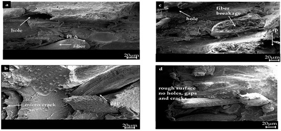 The morphologies of the fractured surfaces of the hybrid systems i.e., EFBF-KCF-PLA (Figure 5a), EFBF-KCF-MAPLA (Figure 5b), BR(EFBF-KCF)-PLA (Figure 5c), and BR(EFBF-KCF)-MAPLA (Figure 5d) are shown respectively. The hybrid system i.e., BR(EFBF-KCF)-MAPLA showed rough surfaces with no holes, micro-cracks or gaps (Figure 5d), perhaps due to better interface adhesion provided by the BR-treated hybrid fibers, and compatibilization effect provided by the MA-modified PLA. This finding agreed with earlier results on the DMA, TGA, mechanical and physical properties stated. In the micrograph of BR(EFBF-KCF)-PLA (Figure 5c), few cracks and gaps were seen. Those of EFBF-KCF-MAPLA (Figure 5b) and EFBF-KCF-PLA (Figure 5a) showed holes, micro-cracks and gaps, which may have contributed to their relatively lower material properties (i.e., mechanical, physical, thermal and dynamic mechanical), arising due to weaker interface adhesion from a high content of hemicellulose, and the brittle behavior of the unmodified PLA [55], especially in the hybrid system EFBF-KCF-PLA.