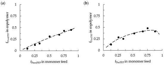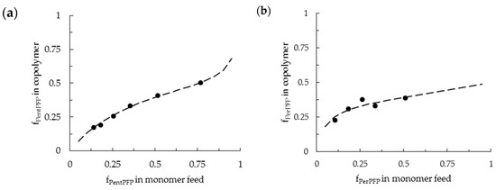 As can be seen in Figure 2 (further fits are shown in the Supplementary Materials), the fits describe the polymer compositions fairly well, indicating that the terminal model can satisfactorily describe the copolymerizations of PentPFP with PhMI, and of PerPFP with PhMI in DCE. This also indicates that there are no significant penultimate effects which would lead to the formation of periodic copolymers.