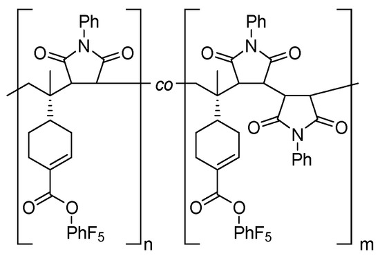 To accomplish this goal, the copolymerization of two active ester-containing non-conjugated vinyl monomers (the pentafluorophenyl esters of 4-pentenoic acid and (S)-perillic acid, abbreviated as PentPFP and PerPFP respectively) with N-phenyl maleimide (PhMI) was investigated, in the hope of obtaining ABA-periodic copolymers, in which A represents the maleimide and B the monomer containing an active ester. After the polymerization, the active ester can be used to functionalize the copolymer with e.g., amine containing moieties [26,27].