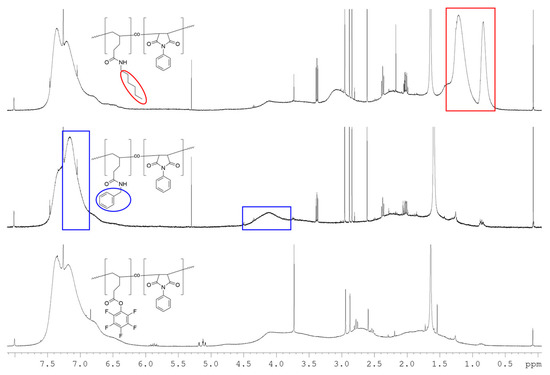 A variety of different conditions was attempted, and in all cases the successful and quantitative post-polymerization functionalization of P(PentPFP-co-PhMI) and P(PerPFP-co-PhMI) could be confirmed by the quantitative disappearance of the characteristic signal pattern in the 19F-NMR spectra, even under very mild conditions such as using 1.1 eq. of amine per active ester group at 50 °C. Additionally, major changes in the 1H-NMR spectra (Figure 8) of the polymers were observed, corresponding to the introduction of the hexyl (in particular the methyl peak at 0.7–0.95 ppm and the methylene peak between 0.95–1.5 ppm) or benzyl groups (methylene peak at 3.8–4.5 and aromatic signals at 6.9–7.3 ppm) in the polymer. Quantification of the degree of functionalization based on the 1H-NMR spectra was not possible since the polymer peaks (especially the backbone signals) are extremely broad and exact integration of signals is difficult. SEC data confirmed that the (apparent) molecular weight of the polymers decreased (shift to higher elution volumes, see Supplementary Materials), as is to be expected since the PFP moiety has a higher molecular weight than either n-hexylamine or benzylamine. This shift is more pronounced for benzylamine, which is likely due to solvent effects.