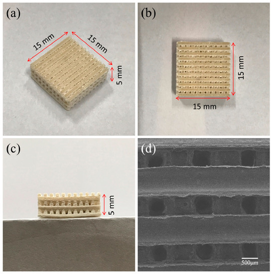 (a–c) Optical images and (d) SEM morphology of a representative three-dimensional rectangular PHBV/10%CS porous scaffold fabricated via SLS (selective laser sintering).