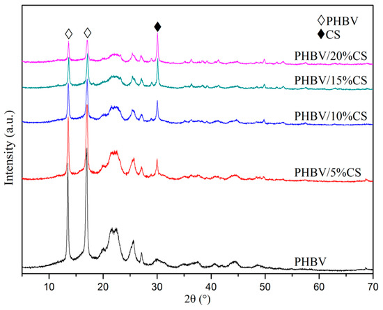 The XRD patterns of the SLS-fabricated scaffolds of different formulations were shown in Figure 3. With the increase of CS content, its diffraction peak intensity increased while PHBV decreased, which indicated that CS was blended into the composite scaffolds and did not recrystallize since its melting point (about 952 °C) [36] was far higher than that of PHBV (about 164 °C) [37]. The diffraction peak positions of PHBV and CS remained unchanged and no other peaks were detected after laser sintering, which indicated that CS was compatible with PHBV. It is noteworthy that adding only 5% CS remarkably decreased the diffraction peak of PHBV in the composite scaffold, suggesting that the incorporation of CS significantly decreased the crystallinity of PHBV. This may be due to CS particles of larger size than PHBV hindered the growth of PHBV grains during recrystallization. The crystallinity was one of the important factors that influenced the degradation rate of the polymers [38,39,40]. The decrease of crystallinity of PHBV could accelerate the degradation of the scaffolds, which may be beneficial for promoting tissue repair.