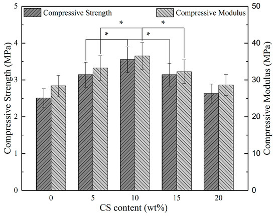 The compressive strength and compressive modulus of PHBV/CS scaffolds as a function of CS content; * represents p < 0.05.