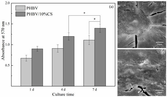 (a) The proliferation of MG63 cells cultured on the PHBV and PHBV/10% composite scaffolds (* represents p < 0.05); the SEM morphologies of MG63 cells cultured on the (b) PHBV and (c) PHBV/10% composite scaffolds on day 4.