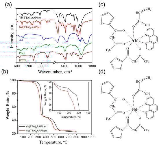 (a) FTIR spectra of AA, Phen, HTTA, Yb(TTA)2AAPhen and Nd(TTA)2AAPhen powders; (b) TGA curves in air flow of Yb(TTA)2AAPhen and Nd(TTA)2AAPhen powders; (c,d) Chemical structures of (c) Yb(TTA)2AAPhen and (d) Nd(TTA)2AAPhen.