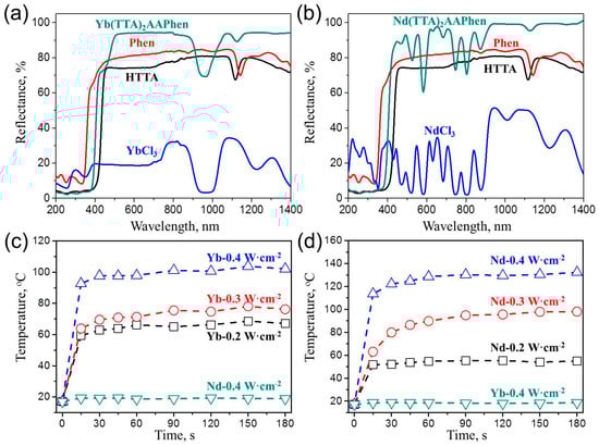 (a) Reflection spectra of Phen, HTTA, YbCl3 and Yb(TTA)2AAPhen; (b) Reflection spectra of Phen, HTTA, NdCl3 and Nd(TTA)2AAPhen; (c,d) The temperature increase of the powders with time upon the irradiations of (c) 980 and (d) 808 nm NIR light.