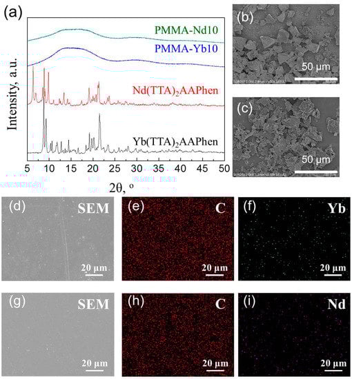(a) XRD patterns of PMMA-Yb10, PMMA-Nd10, Yb(TTA)2AAPhen and Nd(TTA)2AAPhen; (b–d,g) SEM images of (b) Yb(TTA)2AAPhen, (c) Nd(TTA)2AAPhen, (d) PMMA–Yb10, and (g) PMMA–Nd10; (e,f,h,i) EDX mapping images of (e) C, and (f) Yb elements on Yb(TTA)2AAPhen as well as (h) C, and (i) Nd elements on Nd(TTA)2AAPhen.