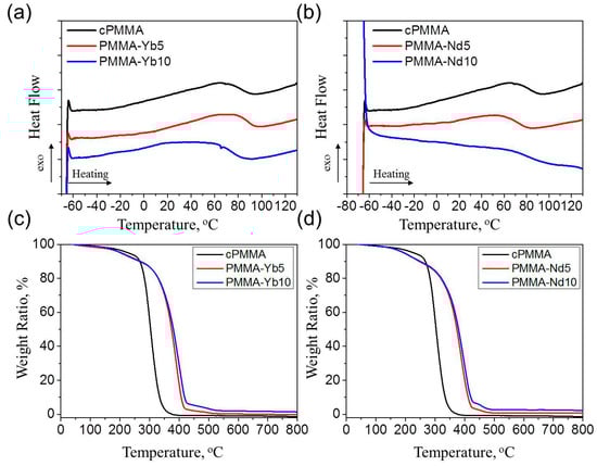 (a,b) The second heating DSC curves of cPMMA and copolymers; (c,d) TGA curves of (c) PMMA–Yb and (d) PMMA–Nd copolymers, in addition to cPMMA.