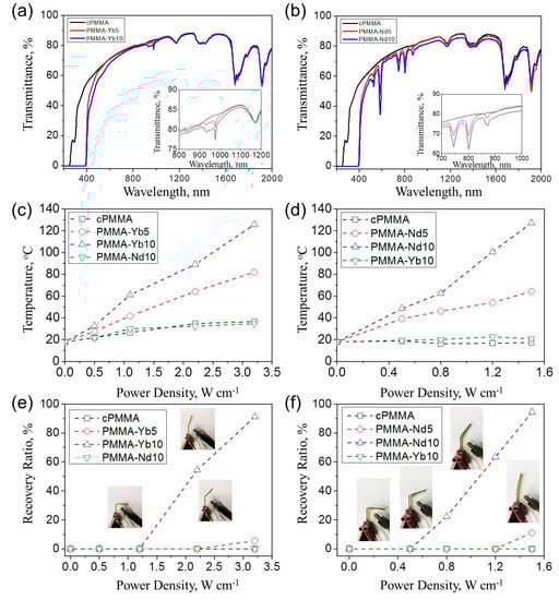 (a,b) Transmittance spectra of (a) PMMA–Yb and (b) PMMA–Nd samples with the thickness of ~1 mm; (c,d) Temperature vs. power density curves of PMMA copolymers upon the irradiation of (c) 980 and (d) 808 nm; (e,f) Recovery ratio of PMMA copolymers upon the irradiation of (e) 980 and (f) 808 nm.