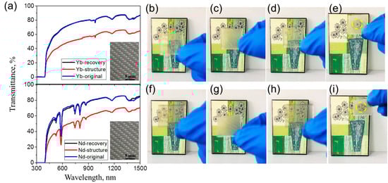 Two pieces of Nylon fabrics (shown in the inserted image in Figure 6a) were first compressed onto the two sides of PMMA–Yb10 or PMMA–Nd10 at a high temperature of 150 °C, which was over their Tg (see Scheme 1). Because of the appearance of the temporary rough surfaces, the transmittance of PMMA–Yb10 decreased from 69.0 to 45.7% at the wavelength of 600 nm for an instance (Figure 6a), while the sample became opaque (Figure 6c) in comparison with the original status (Figure 6b). Heating up to 150 °C triggered the complete recovery of the surface topography and the sample transparency (Figure 6d). The transmittance at the wavelength of 600 nm also increased to 68.4%, suggesting a recovery ratio of 99% (Figure 6a). Here, upon the precise irradiation of 980 nm NIR light onto the on-demand area of the compressively deformed PMMA–Yb10, a localized shape recovery was achieved as indicated by the yellow circle and the scene behind appeared (Figure 6e). Similar selective microstructure recovery was also observed for PMMA–Nd10 upon the irradiation of 808 nm NIR light (Figure 6f–i). As reported by a previous research, a 3 × 3 array of ITO heaters was used to realize the sequential recovery of different regions of an EVA film with a compressively deformed microprism array []. By contrast, the usage of a selectively photo-responsive SMP obviously achieved the remote and precise control of the shape recovery at randomly localized areas.
