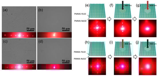 (a–d) OM images and diffraction patterns of (a,b) PMMA–Yb10 and (c,d) PMMA–Nd10 with the (a,c) temporary gratings and (b,d) recovered surfaces. (e–j) Schematic diagrams and diffraction patterns of the cross-stacked PMMA–Yb10 (front) and PMMA–Nd (back) with temporary grating structures upon different irradiations of 980 or 808 nm NIR light.