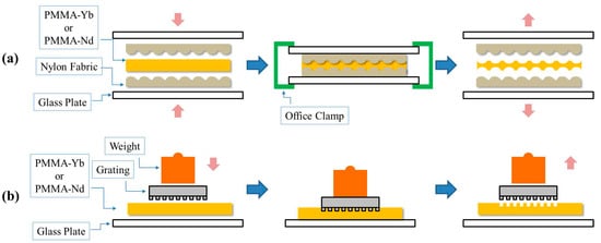 Creation procedures of temporal structures at microscale on PMMA–Yb10 and PMMA–Nd10 surfaces using (a) Nylon fabrics and (b) glass grating.