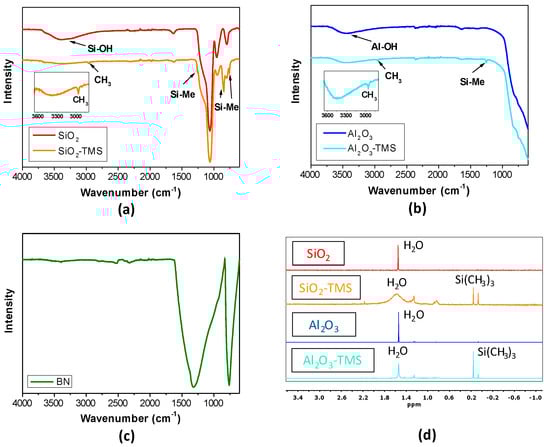 IR spectra of pristine and functionalized silica (a) as well as alumina (b) and non-functionalized BN (c) as well as the 1H-NMR spectra of the pristine and functionalized silica and alumina particles (d); ”H2O” acronyms all inorganic “OH” groups.