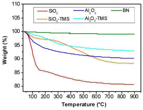 In addition, thermogravimetric analyses were performed with unreacted as well as trimethyl silyl-functionalized alumina and silica nanoparticles (Figure 2; BN did not show any weight loss in the temperature range). The data show a pronounced weight loss in the range of 15 wt % of the pristine silica at temperatures below 200 °C, which originates from the evaporation of surface-adsorbed water molecules. Upon continued heating to temperatures higher than 200 °C, the weight loss increases to a total of 20 wt %, which is indicative of the condensation of adjacent silanol groups yielding silyl ethers. The weight loss of unreacted alumina starts in the same temperature range as silica but amounts to a total of approx. 5 wt % only, which is indicative of lower amounts of aluminum hydroxide groups present at the surface (compared to silica). Unlike silica, the thermograms of alumina do not reveal a second step of weight loss starting at temperatures higher than 200 °C, which means that the condensation of aluminum hydroxide groups does not play a significant role in the temperature range until 900 °C. Hence, it may be argued that the silica particles have a higher content of hydroxy groups on and larger amounts of water adhered to their surfaces than the alumina particles do. The trimethyl silyl-functionalized particles have significantly lower amounts of water adsorbed, and, consequently, only show weight losses in the range of 1 (alumina) and 2.5 wt % (silica) for temperatures up to 200 °C. At elevated temperatures, the trimethyl silyl groups are cleaved from the particles and, overall, they show a weight loss of 10 wt % in the case of silica and 5 wt % in the case of alumina (starting from approx. 250 °C). The higher total weight loss in the case of functionalized silica particles (compared to functionalized alumina particles) can be explained by a higher degree of functionalization (a larger number of trimethyl silyl groups per gram) due to the larger number of hydroxyl groups (see above).