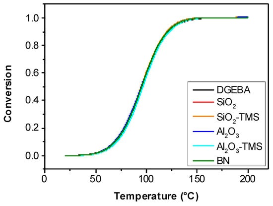 For the production of nanocomposites, mixtures of DGEBA and AEAP in a stoichiometric 2:1 ratio (mol:mol) and 5 wt % of the respective nanoparticles were thoroughly mixed using mechanical stirring and ultrasonic treatment of the mixture prior to pouring them into steel molds of the targeted geometry and thermal curing at 80 °C for 3 h. The curing kinetics were monitored by differential scanning calorimetry with a heating rate of 10 K·min−1, starting at room temperature (Figure 3). The curing rate was found not be altered by the presence or absence of nanoparticles. Notably, even non-surface functionalized silica did not accelerate the curing reaction, despite the huge abundance of hydroxy groups with a potential autocatalytic effect (either as functional groups on the nanoparticles’ surfaces or in the adsorbed water molecules). The epoxy resin as well as all five types of nanocomposites showed the same curing rate and reached the same extent of curing.