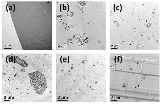 The dispersion of the nanoparticles in the epoxy resin matrix was investigated by TEM images of cross sections of the specimens (Figure 4). Large aggregates of nanoparticles were found in the nanocomposites containing non-functionalized alumina and silica particles (Figure 4b,d). On the contrary, the surface-functionalized analogues (Figure 4c,e) were more uniformly dispersed in the polymer matrix, resulting in the formation of smaller aggregates. Hexagonal BN particles (Figure 4f), which exhibit only low amounts of hydroxy groups on their surface, showed similar dispersion to the surface-functionalized silica and alumina particles.