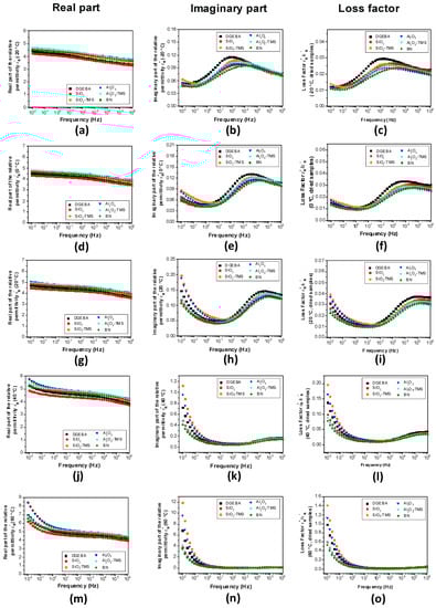 Real part (a,d,g,j,m) and imaginary part (b,e,h,k,n) of the permittivity as well as the loss factor (c,f,i,l,o) of the epoxy resin and the nanocomposites at −20 °C (a,b,c), 0 °C (d,e,f), 20 °C (g,h,i), 40 °C (j,k,l), and 60 °C (m,n,o).