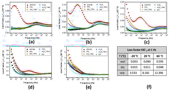 Loss factor of the epoxy resin and the nanocomposites at −20 °C (a), 0 °C (b), 20 °C (c), 40 °C (d), and 60 °C (e). A comparison of the loss factor of non-functionalized silica in dry and ”wet” states is provided in the inserted table (f).