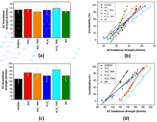 AC and DC breakdown strength of the epoxy resin and the nanocomposites (a,c) as well as the Weibull plots (b,d).