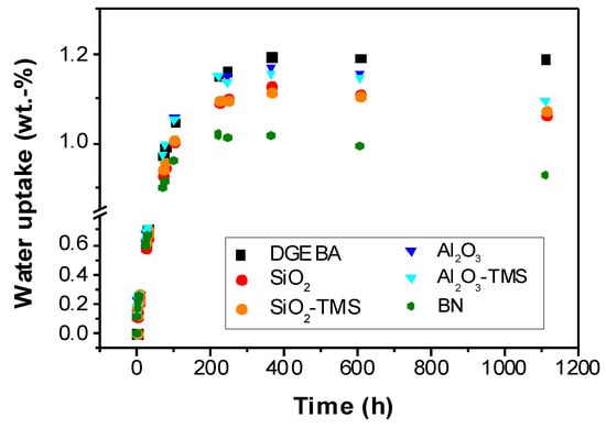 As the water uptake upon storage under ambient conditions was found to alter the permittivity of the specimens, the water absorption was quantified in a climate chamber operated at elevated temperatures of 50 °C and (standardized) 50% relative humidity for 6 weeks (Figure 8). Considering the final measurements as (quasi-) equilibrium conditions, three classes of water absorption can be found: the unfilled epoxy resin showed the highest absorption of 1.2 wt %, the nanocomposites containing any type of silica or alumina showed medium absorption of 1.1 wt %, and the nanocomposite containing BN showed the lowest absorption of 0.9 wt %. The nanoparticles were added in 5 wt %; considering the density of alumina (3.95 g·cm−3), silica (2.60 g·cm−3), BN (2.10 g·cm−3) [24] and the polymer (1.15 g·cm−3) [14], volume fractions of the nanoparticles of 2.0 (silica), 1.5 (alumina), and 2.7 vol % (BN) may be calculated. Hence, the similar water uptake of nanocomposites containing silica or alumina on the one hand and the low water absorption of the network containing BN on the other cannot be exclusively referred to the lower water adsorption by the nanoparticles (compared to the unfilled epoxy resin). Instead, also different degrees of water adsorption by the nanoparticles themselves must be considered: Alumina and silica interact more intensely with water, while BN does not adsorb any water (cp., Section 3.1 and Figure 2). While the crosslinked resin (with a surface energy of 37 mN·m−1) itself only absorbs water in the range of 1 wt %, the different degrees of interaction of non-functionalized and functionalized particles are not resolved in this water uptake study (all types of silica and alumina nanoparticles can adsorb more than 1 wt % of water). However, while the water uptake of the unfilled resin increased in the course of the 1200 h study until a maximum (equilibrium) of 1.2 wt % had been reached, the water uptake of all nanocomposites decreased after reaching a maximum value by up to 0.1 wt %. This observation can be explained by structural re-orientation of the nanoparticles in the polymer matrix that, due to nanoparticle-polymer interactions (Tanaka model) renders the network stiffer and, consequently, enables the uptake of reduced amounts of water only [25]. The permittivity of the “wet” nanocomposites (Section 3.2.) at 40 and 60 °C, respectively, reflects the effect of the assumed structural reorientation at the conditions of this study (50% r.h. at 50 °C).