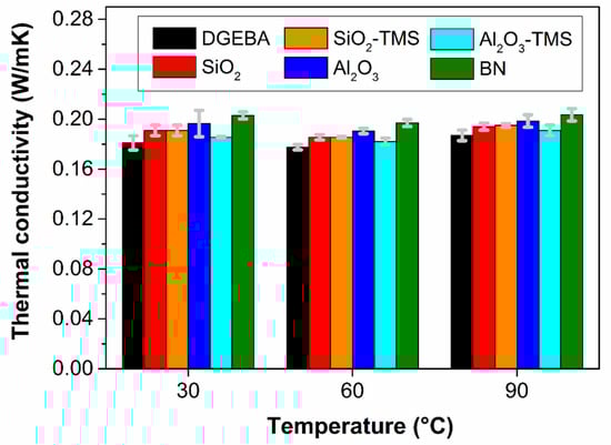 At room temperature, the nanoparticles used in this study exhibit thermal conductivities of 0.7 (fused silica) [24], 23 (sintered alumina) [24], and 390 W·m−1·K−1 (bulk hexagonal BN) [11]. The thermal conductivity was measured on disc-shaped specimens with a height of 2–3 mm at temperatures of 30, 60, and 90 °C. The thermal conductivity of a given type of specimen was not significantly altered by the temperature, despite the literature reporting an increase of the thermal conductivity at elevated temperatures [26,27,28]. In each of the three sets of measurements (Figure 9), the unfilled epoxy resin always had the lowest thermal conductivity of approximately 0.18 W·m−1 K−1, while the nanocomposite containing hexagonal BN always had the highest thermal conductivity of approx. 0.20 W·m−1 K−1. Considering the standard deviations, only the nanocomposites containing hBN had a higher thermal conductivity than the unfilled resin and all other nanocomposites. Notably, in this study, this is the type of nanofiller with the largest particle size and the highest (bulk) thermal conductivity. By the addition of hBN nanofillers in 5 wt % quantities, the thermal conductivity could be increased by approximately 10%.