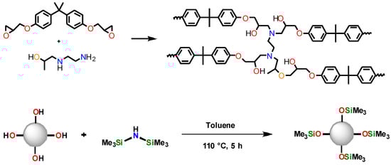 Top: Schematic representation of the ring-opening crosslinking reaction of Bisphenol A diglycidyl ether (DGEBA) with 1-(2-aminoethylamino)-2-propanol (AEAP); Bottom: Schematic representation of the surface functionalization of inorganic nanoparticles bearing M–OH groups with hexamethyl disilazane (HMDS).