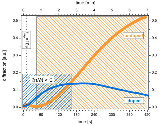 Direct comparison of the first growth step on a real time scale. Exposure duration was 10 s for both the undoped (orange) and doped system (blue), respectively. The shaded areas correspond to the time frames with positive change of the refractive index (∂n/∂t > 0).
