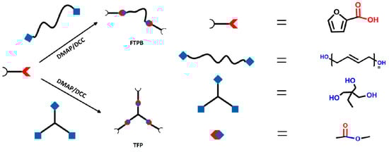 Synthesis routes of furfuryl-terminated polybutadiene (FTPB) and trifurfuryl propane (TFP).