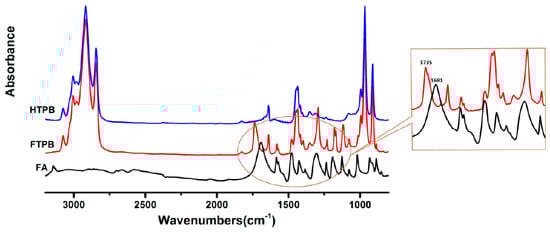 Figure 2 is the FTIR spectrum of the comparison among HTPB, FTPB, and FA. From Figure 2, distinguished absorption peaks of ester carbonyl and furan ring could be observed in the FTIR spectrum of FTPB contrasted with HTPB and FA: the carbonyl of furoic acid peak shifted from 1691 to 1735 cm−1 after esterification, which lent sufficient support to the accomplishment of esterification reactions.