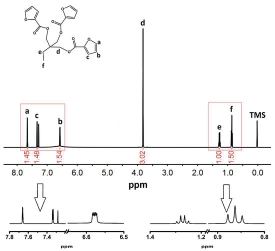 In the FTIR (KBr, cm−1) spectra of TFP and TMP (Figure 3), it was also found that the absorption peaks of the furan group and the carbonyl group were shown to fully prove that the furoic acid groups were successfully connected to the ends of TMP. Moreover, the results of 1H NMR of TFP shown in Figure 4 revealed coincidence with the number of hydrogen atoms contained in the monomer, further supporting the chemical structures of FTPB.