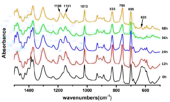 The infrared absorbance of FTPB-PDMI’s functional group with the reaction time (the stretching vibration of furan rings corresponding to the peaks at 1151 and 1013 cm−1; the peaks at 1188 cm−1 corresponding to the C–C bonds’ stretching vibration of Diels–Alder adducts; the peaks at 833, 766, and 695 cm−1 corresponding to out-of-plane bending vibration of C–H bonds on C–C bonds; the peaks at 623 cm−1 corresponding to the out-of-plane bending vibration C–H bonds on C=C bonds of maleimide).