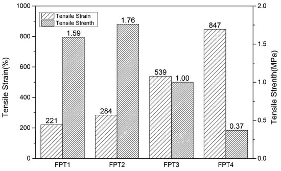 Low bond energy of the Diels–Alder bonds in the material will lead to the decline of mechanical properties, which is the same to the FTPB-PDMI system. It is not enough to maintain the mechanical performance only by the FTPB-PDMI system, so this paper will use the FTPB-PDMI system of Diels–Alder reaction as the main system with a certain proportion of TFP as a chain extender to improve mechanical property and self-repairing performance. The tensile performance of the FTPB film only cured by PDMI was tested, and the tensile strain and tensile strength data is shown in Table 1: the mechanical strength of the film was low. The addition amounts of the chain extender TFP were, separately, 20%, 10%, 5%, and 0%, and corresponding samples FPT1, FPT2, FPT3, and FPT4, respectively, were obtained and their tensile properties are shown in Figure 6.
